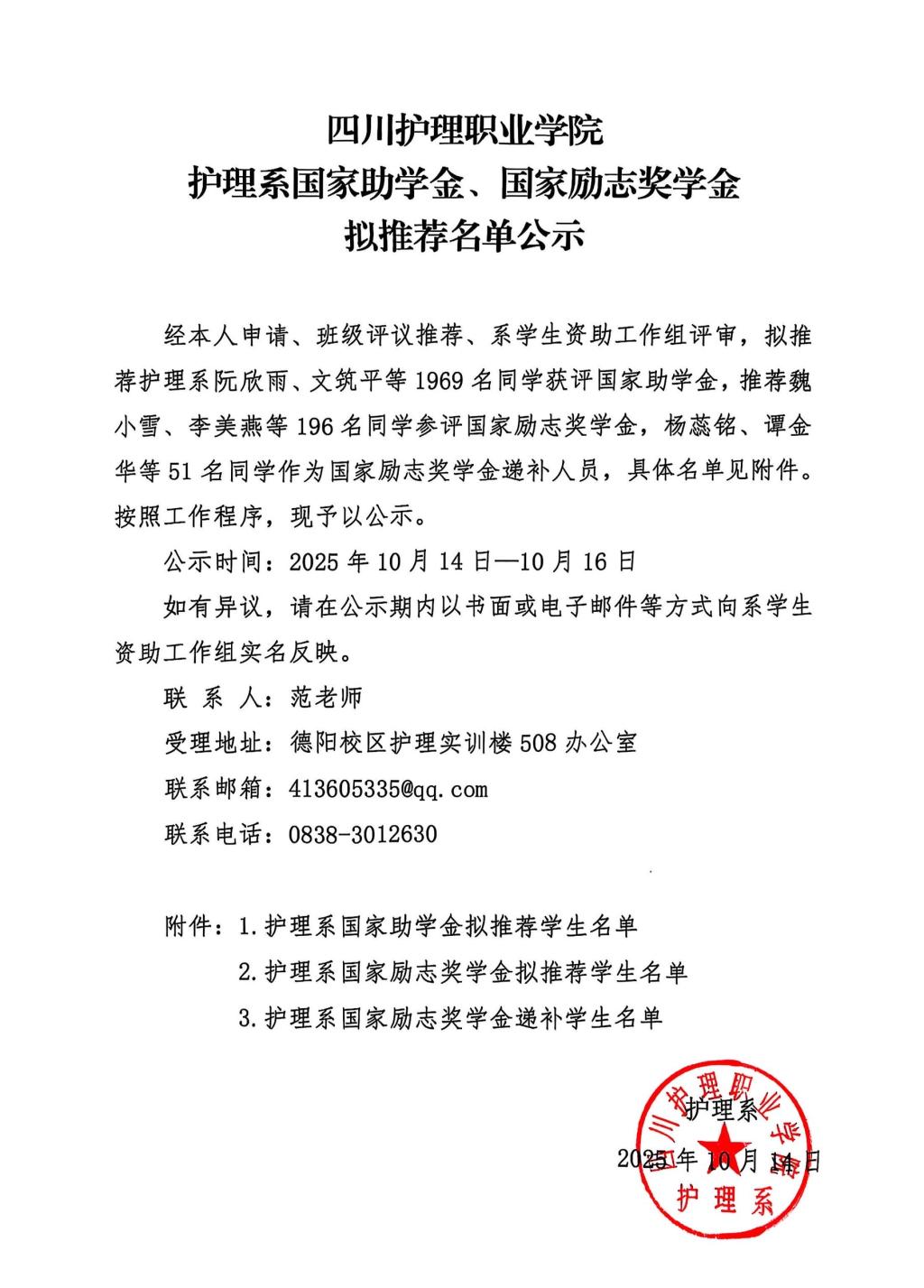 四川护理职业学院护理系国家助学金、国家励志奖学金拟推荐名单公示
