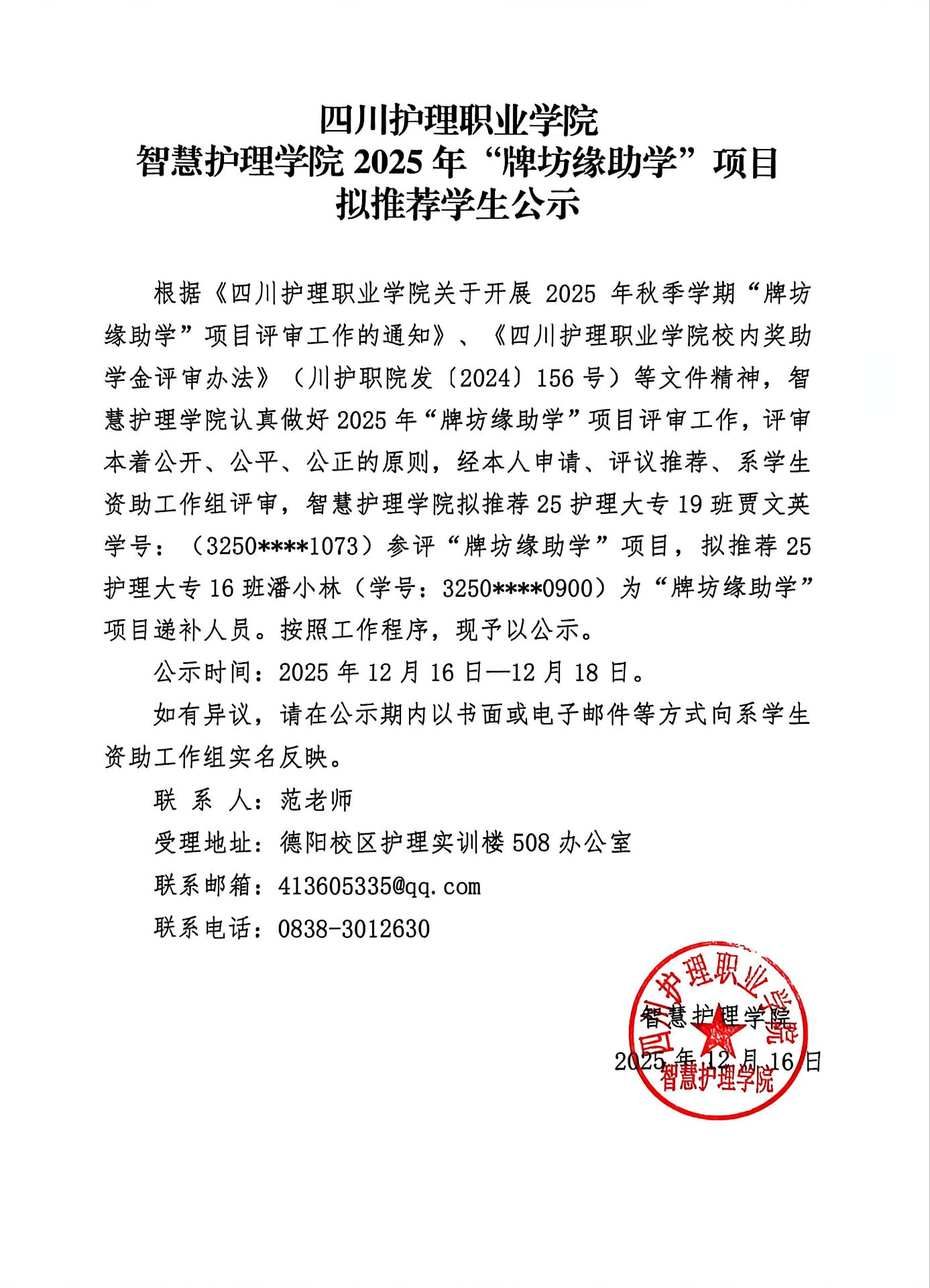 四川护理职业学院智慧护理学院2025年“牌坊缘助学”项目拟推荐学生公示