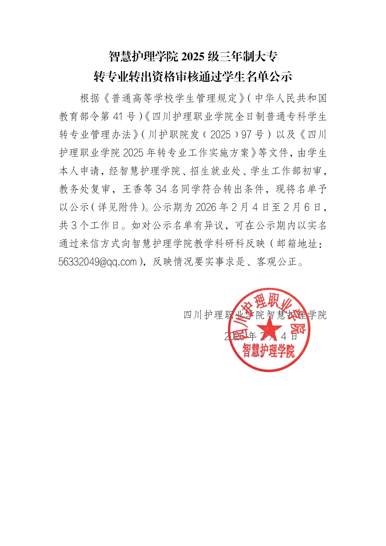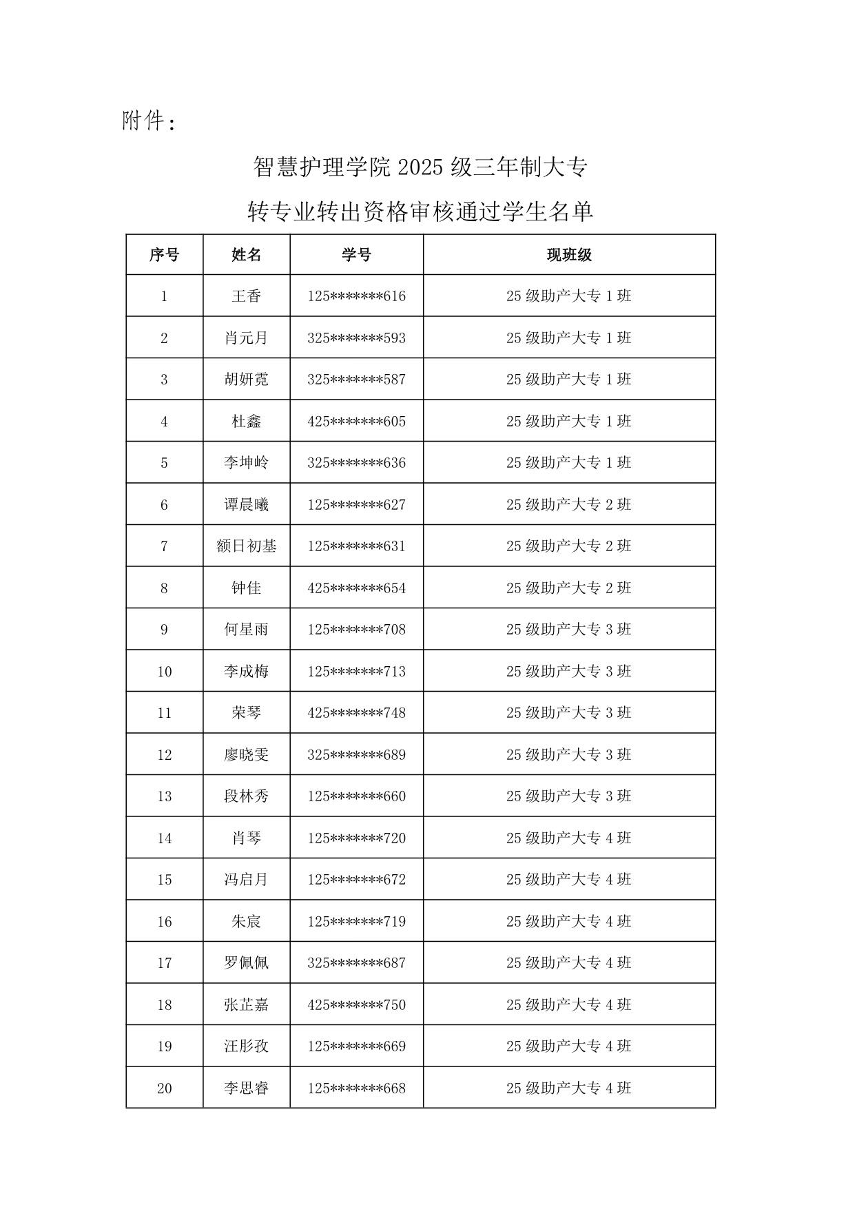智慧护理学院2025级三年制大专转专业转出资格审核通过学生名单公示