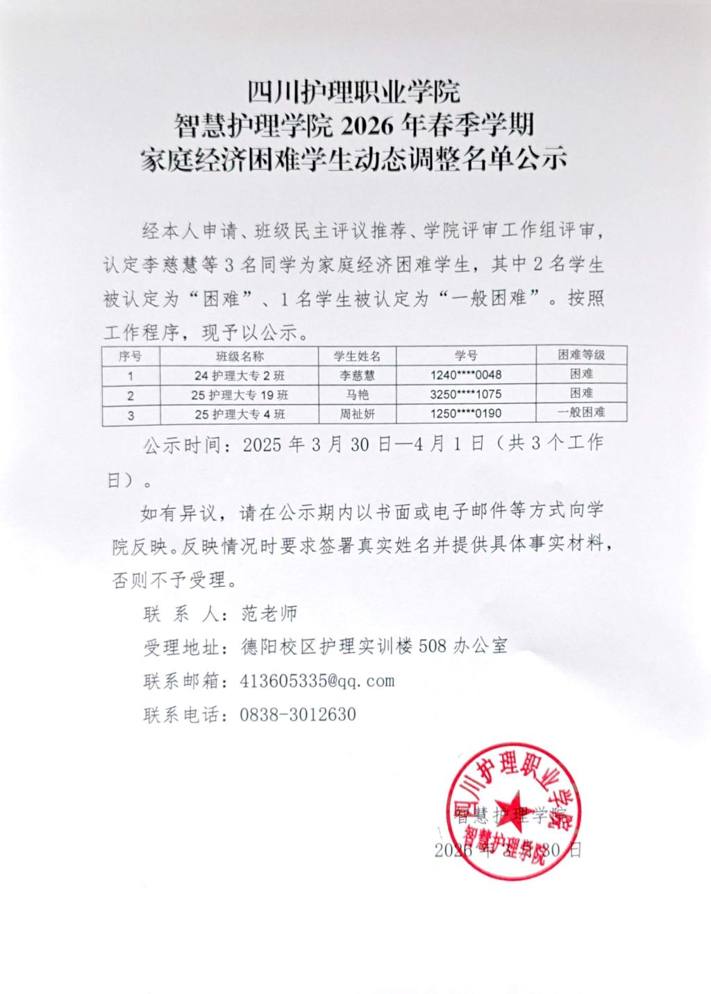 四川护理职业学院智慧护理学院2026年春季学期家庭经济困难学生动态调整名单公示