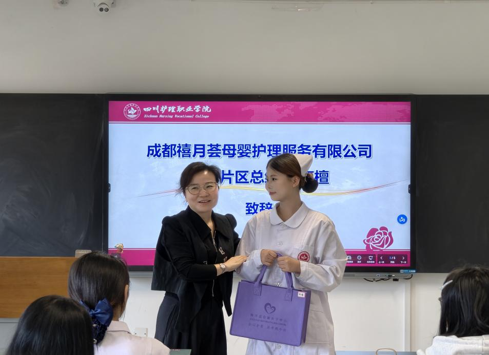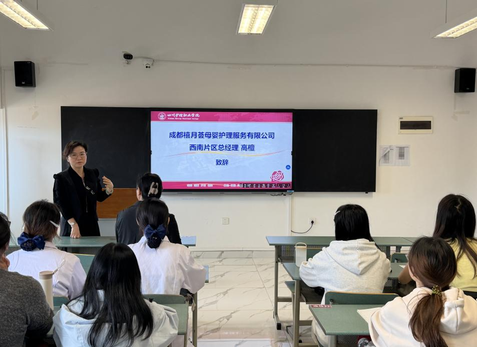 随后,高檀致辞。她传达了企业对禧月荟订单班项目的高度重视与对全体学生的深切关怀。并表示母婴护理人才队伍的建设对行业发展具有重要意义,禧月荟将全力支持订单班建设,依托自身专业的服务团队、完善的实践平台,助力学生成长成才。禧月荟的老师们还在现场为全体学生分发了伴手礼,传递企业的关怀与期许,鼓励同学们认真学习、不负韶华。